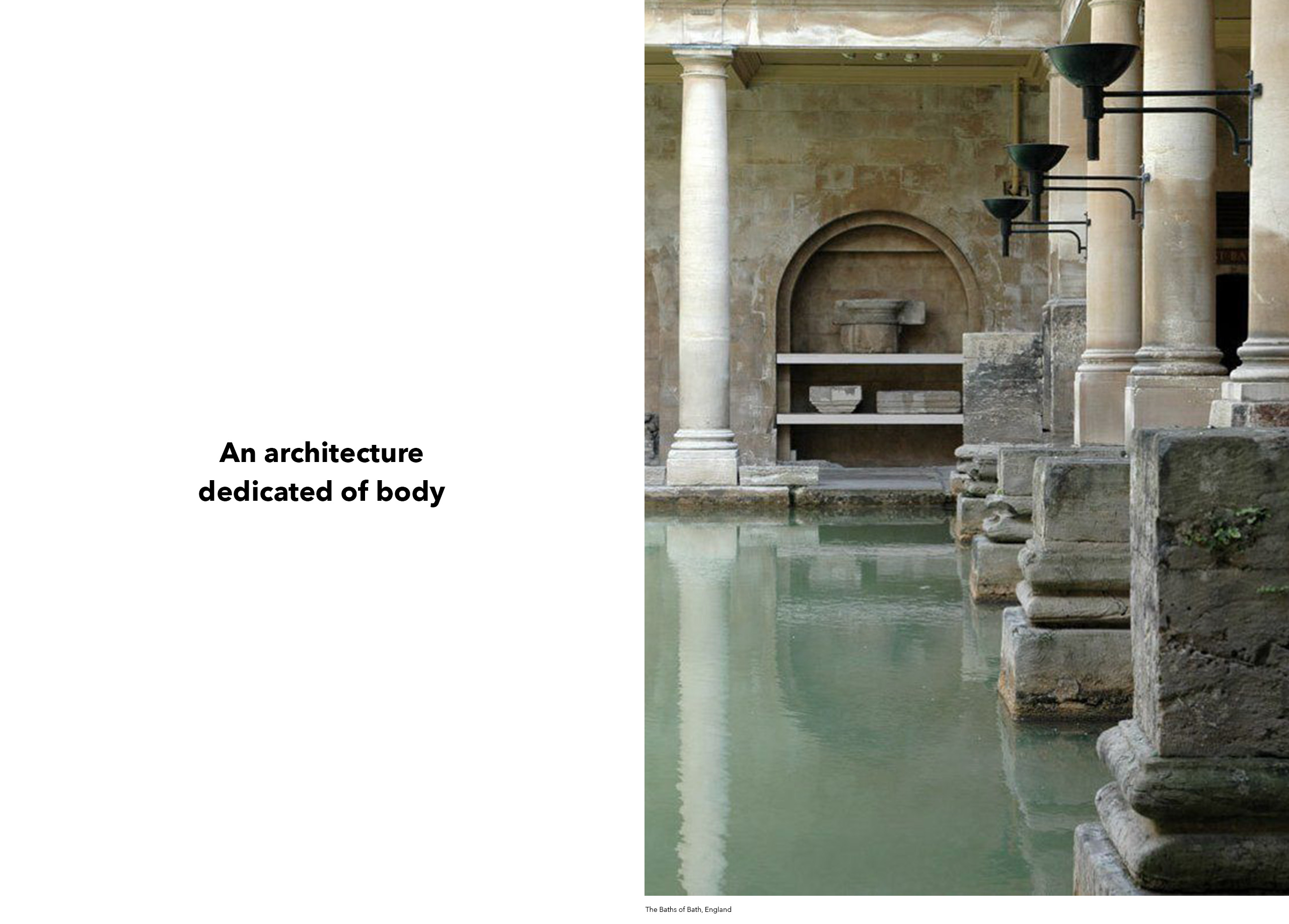 frequently enriched with mosaics, marble surfaces, and sculptural elements. These Roman thermae form the foundation of the modern spa, conceived as a carefully staged architecture devoted to well-being. In the periods that followed, particularly during the Middle Ages, a more austere approach prevailed, reflecting a largely utilitarian vision of such spaces. Enclosed and introspective, reminiscent of monastic cells, these environments favored subdued, almost mystical lighting and gentle spatial transitions. This legacy continues to inform contemporary spa design, where calm and restraint remain central aesthetic values.