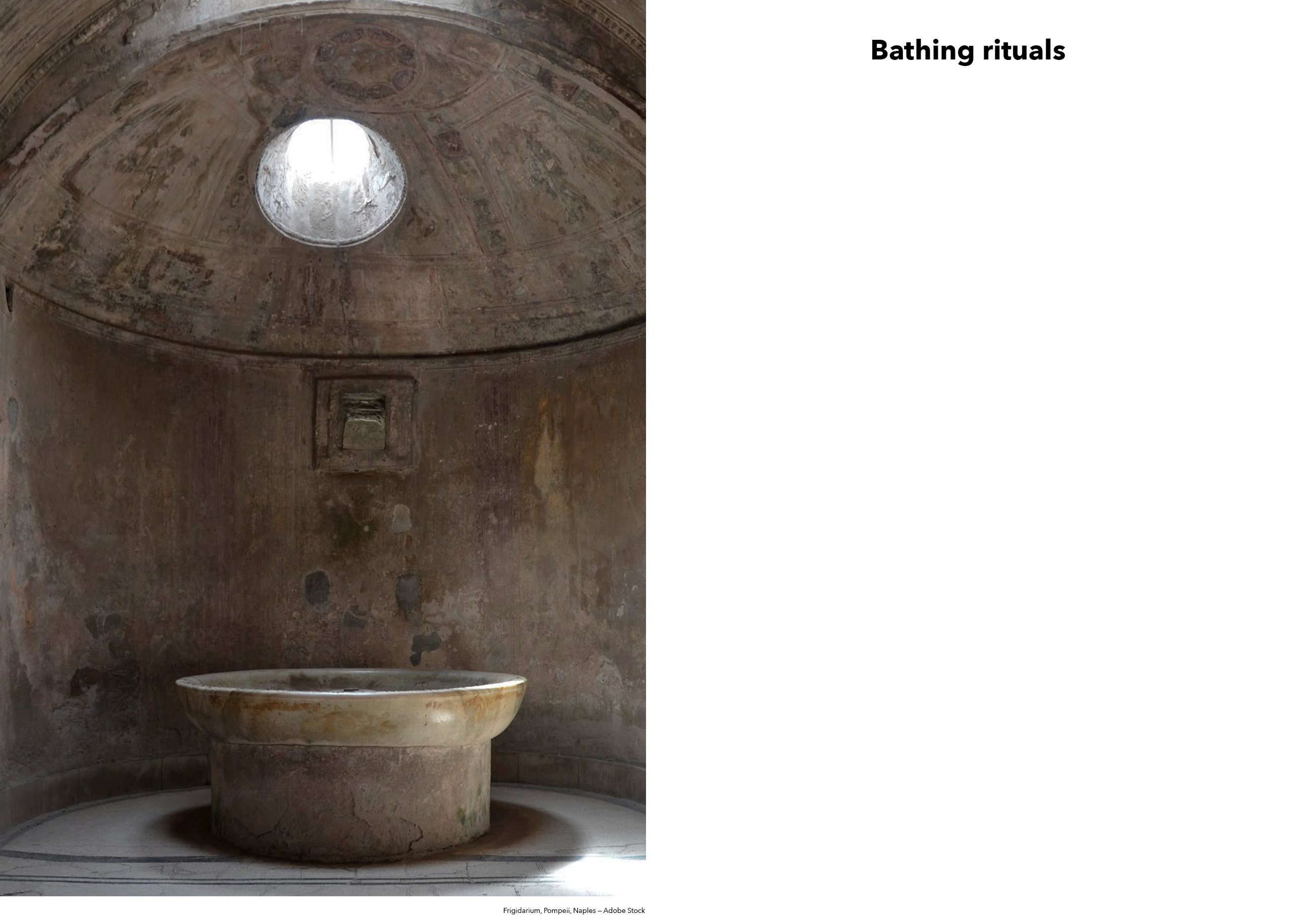 The history of bath architecture offers insight into how each era has conceived the body, space, and social interaction. Over time, it has also been shaped by evolving stylistic vocabularies, seeking a balance between functionality and aesthetic expression. Rooted in the principles of imperial architecture, Roman baths were most often designed around axial, symmetrical plans, occasionally crowned with monumental vaults and domes. They reveal a refined understanding of the interplay between water, light, and materials. The bather’s experience unfolded as a ritualized journey through a sequence of spaces—the caldarium, tepidarium, and frigidarium—