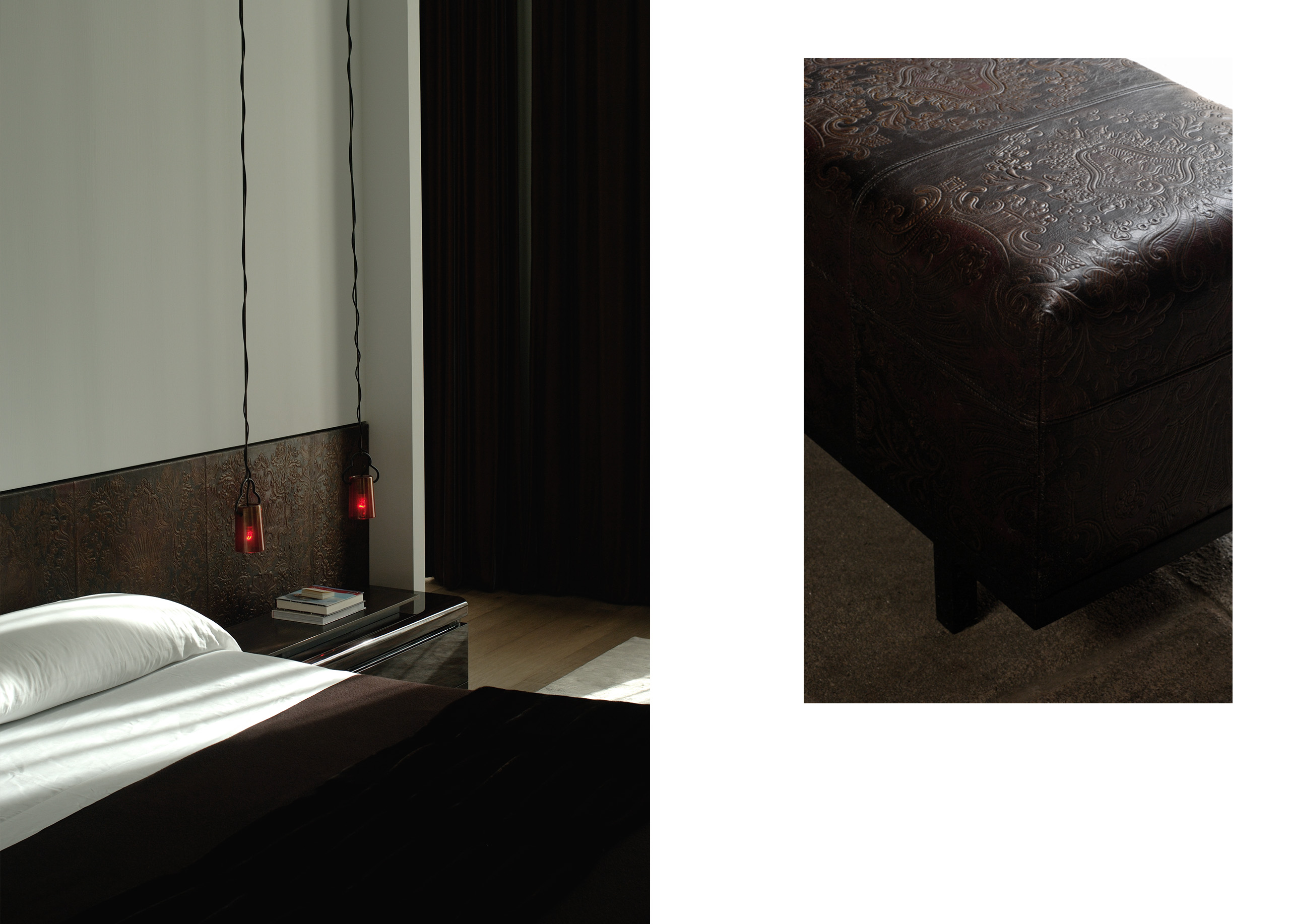 Parfois, le motif s’invite de manière plus classique dans l’univers de Liaigre. Mais là encore, le Studio a tenu dès le départ à marquer sa différence. Dans un souci d’élégance, il s’inscrit fréquemment ton sur ton à la surface d’un matériau, sur certains modèles de tapis il apparaît dans un jeu entre différente hauteurs ou différents tissages de laine, il est parfois simplement texturé sur le piètement en terre cuite d’une table, ou s’inscrit discrètement ton sur ton à la manière de ces girafes dont les contours et le léger relief se détachent délicatement à la surface d’un mur en porcelaine blanche de Nymphenburg. Le cuir de Cordoue (un cuir dont les motifs sont estampés) est traité en majesté dans de grandes réalisations comme la très