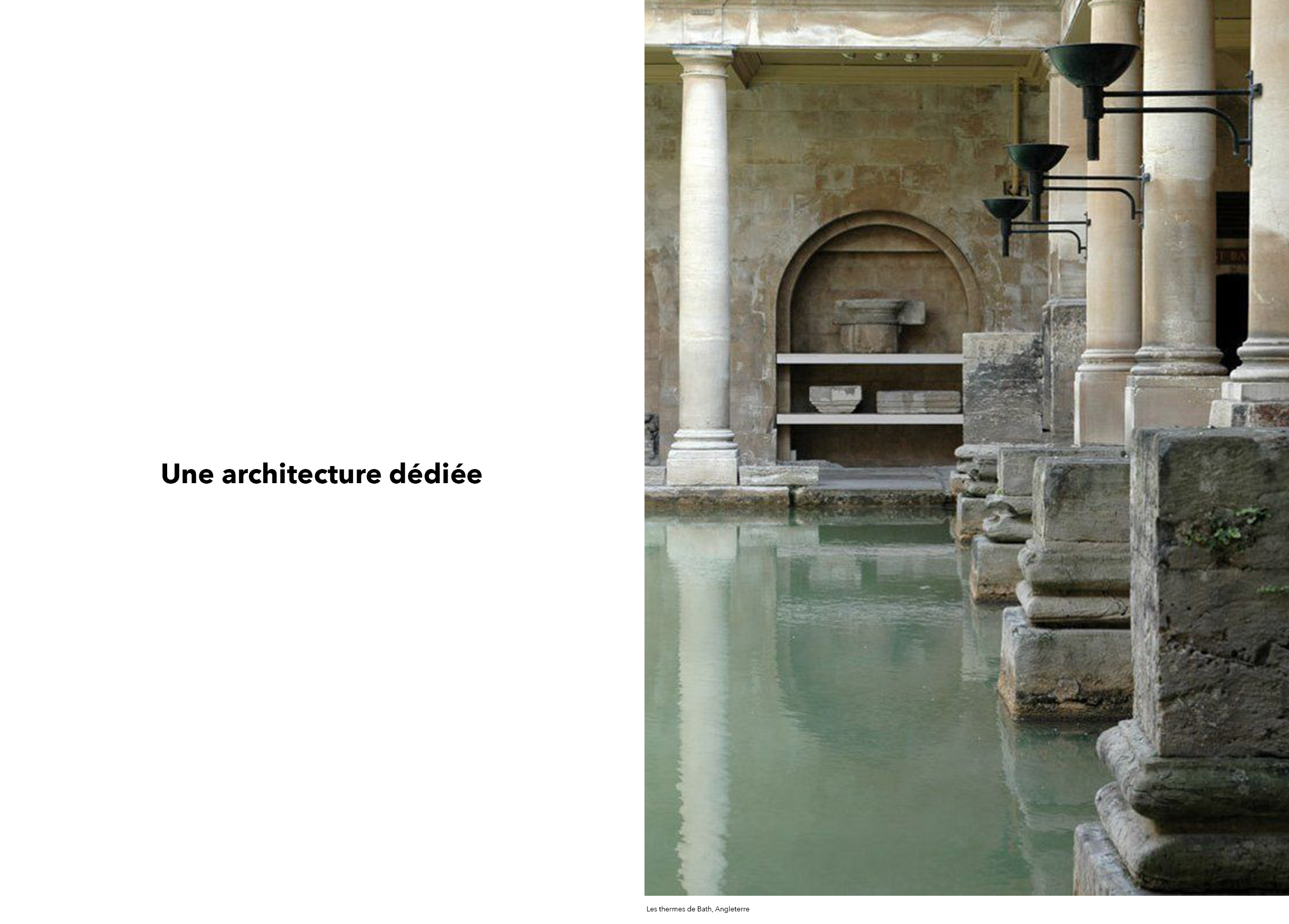 revêtements de marbre et de sculptures. Ce sont les thermes romains qui constituent la matrice du spa moderne en tant qu’architecture scénographiée et dédiée au bien-être. La période qui suit, en particulier le moyen-âge, affirme une sobriété en rapport avec une conception avant tout utilitaire de ce type d’espace. Celui-ci est clos et plus introspectif, à l’image de la cellule monastique ; la lumière tamisée y est atténuée et se veut presque mystique, la transition entre les pièces est douce. Là encore on peut mesurer l’influence de ce type d’approche sur l’aménagement des spas contemporains dans l’idéal d’une esthétique évoquant le calme et une certaine retenue.