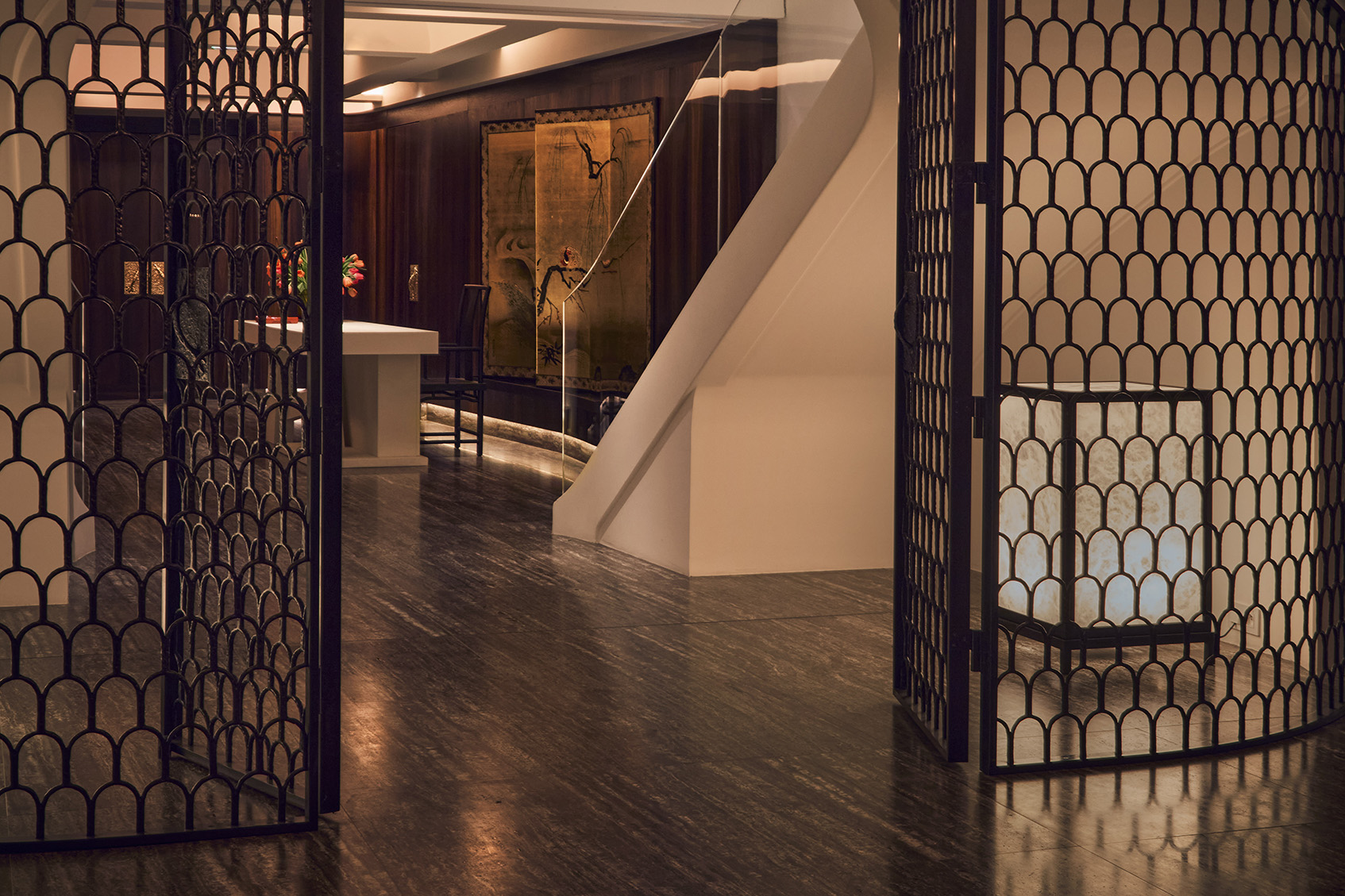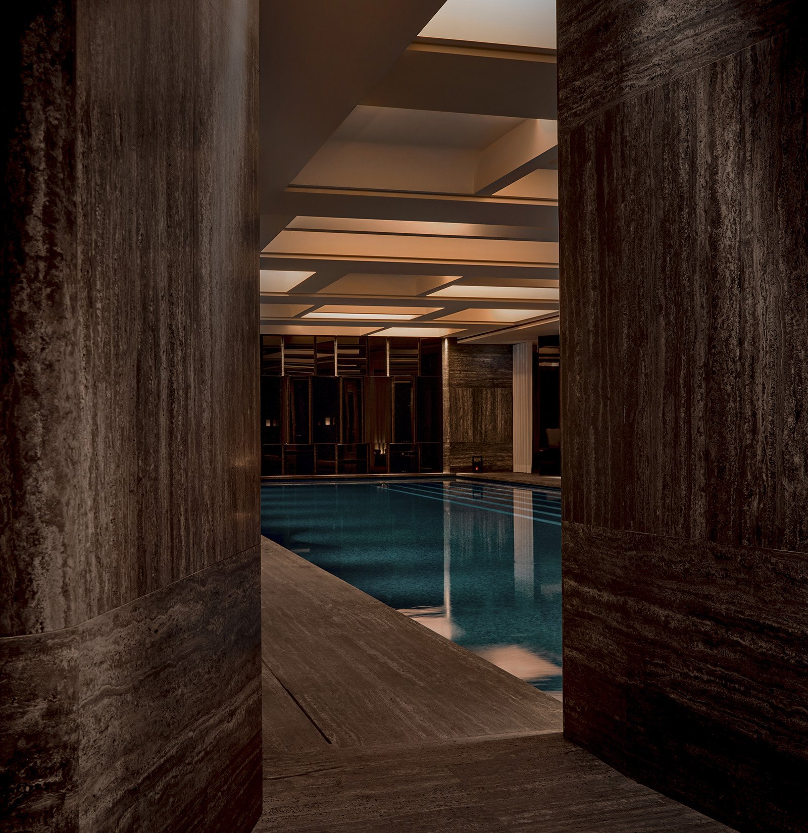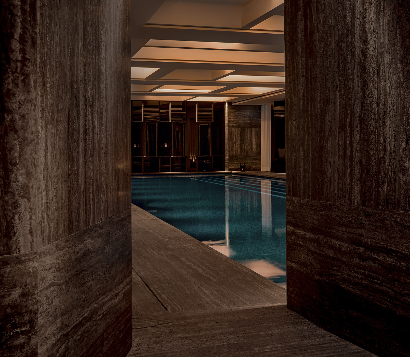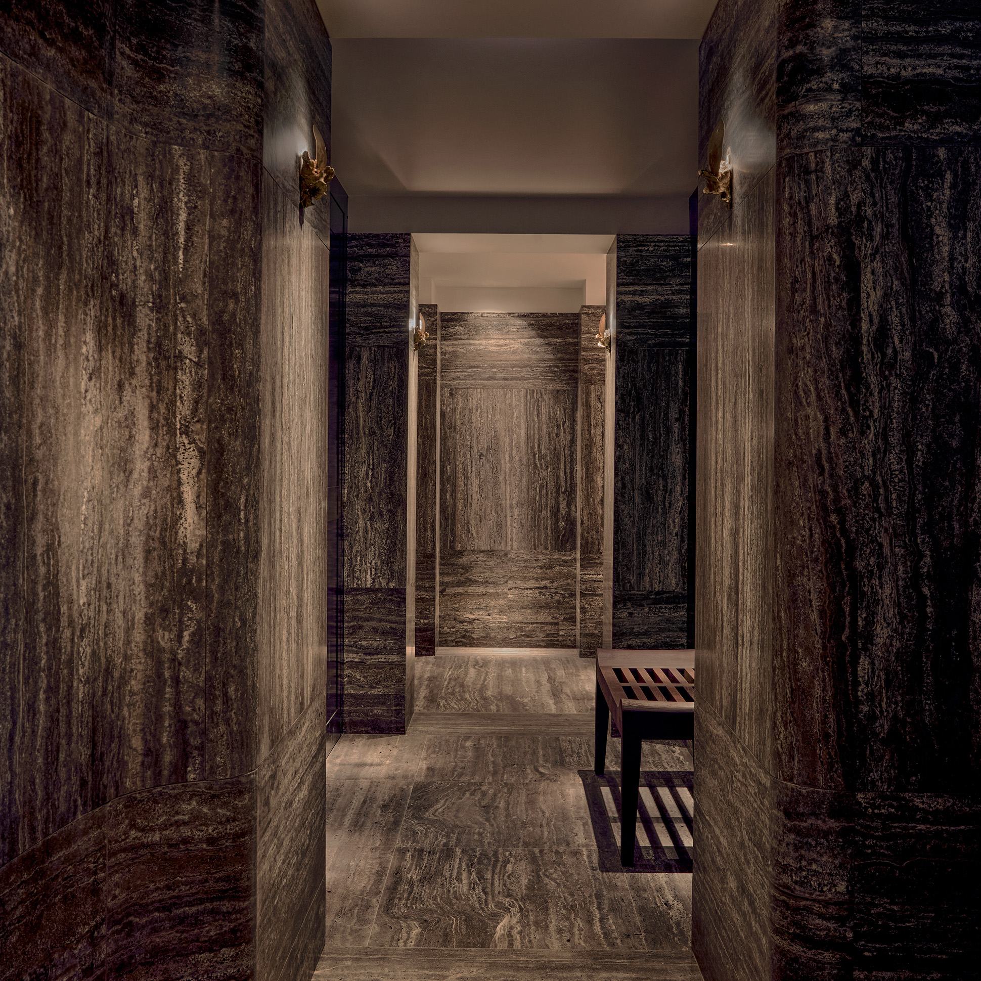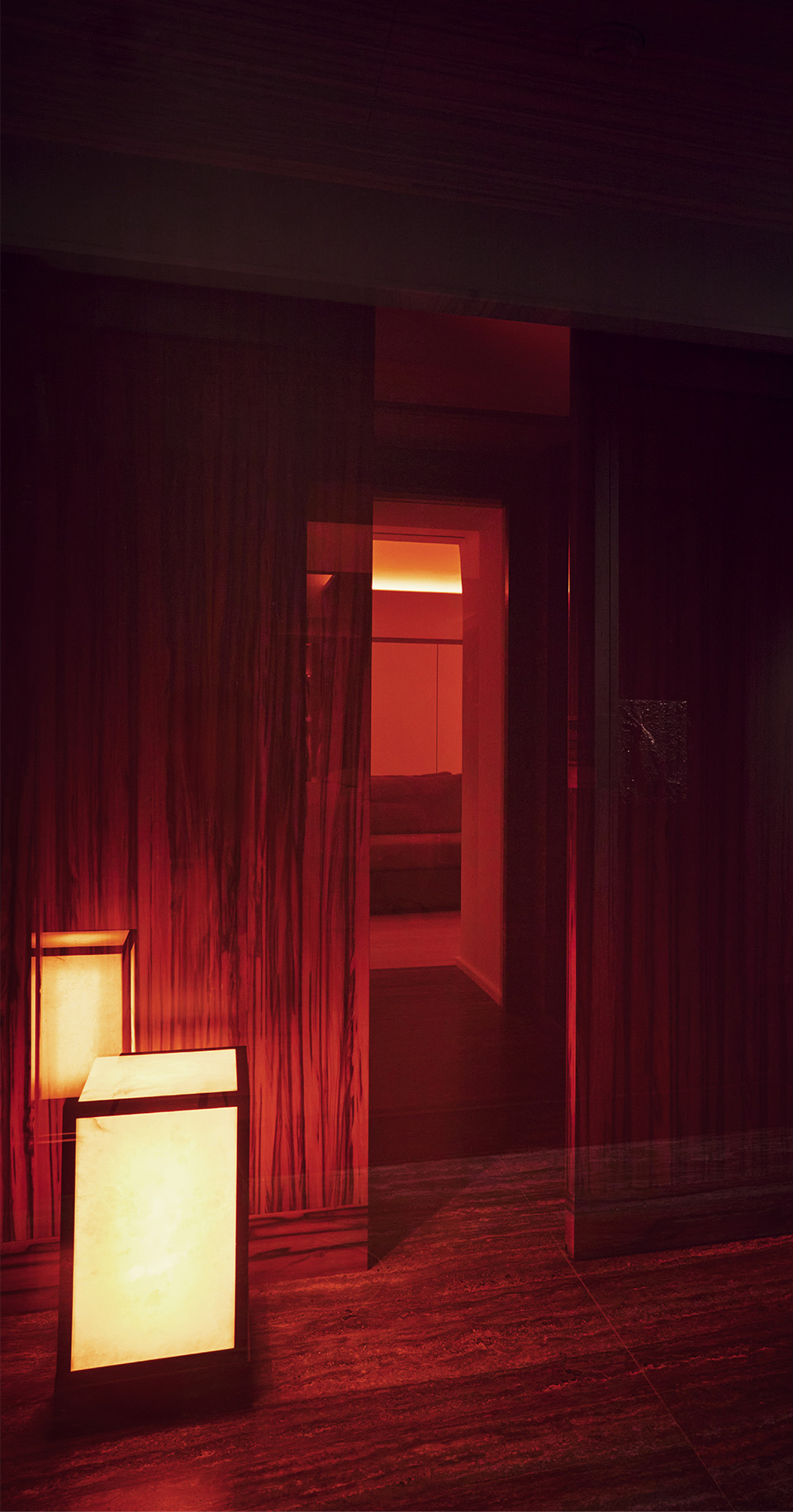 La lumière vient du sol ce qui contribue à créer une atmosphère enveloppante, cette dernière caressant les parois et les sols de travertin, ainsi que les surfaces de chêne fumé ou de laque.