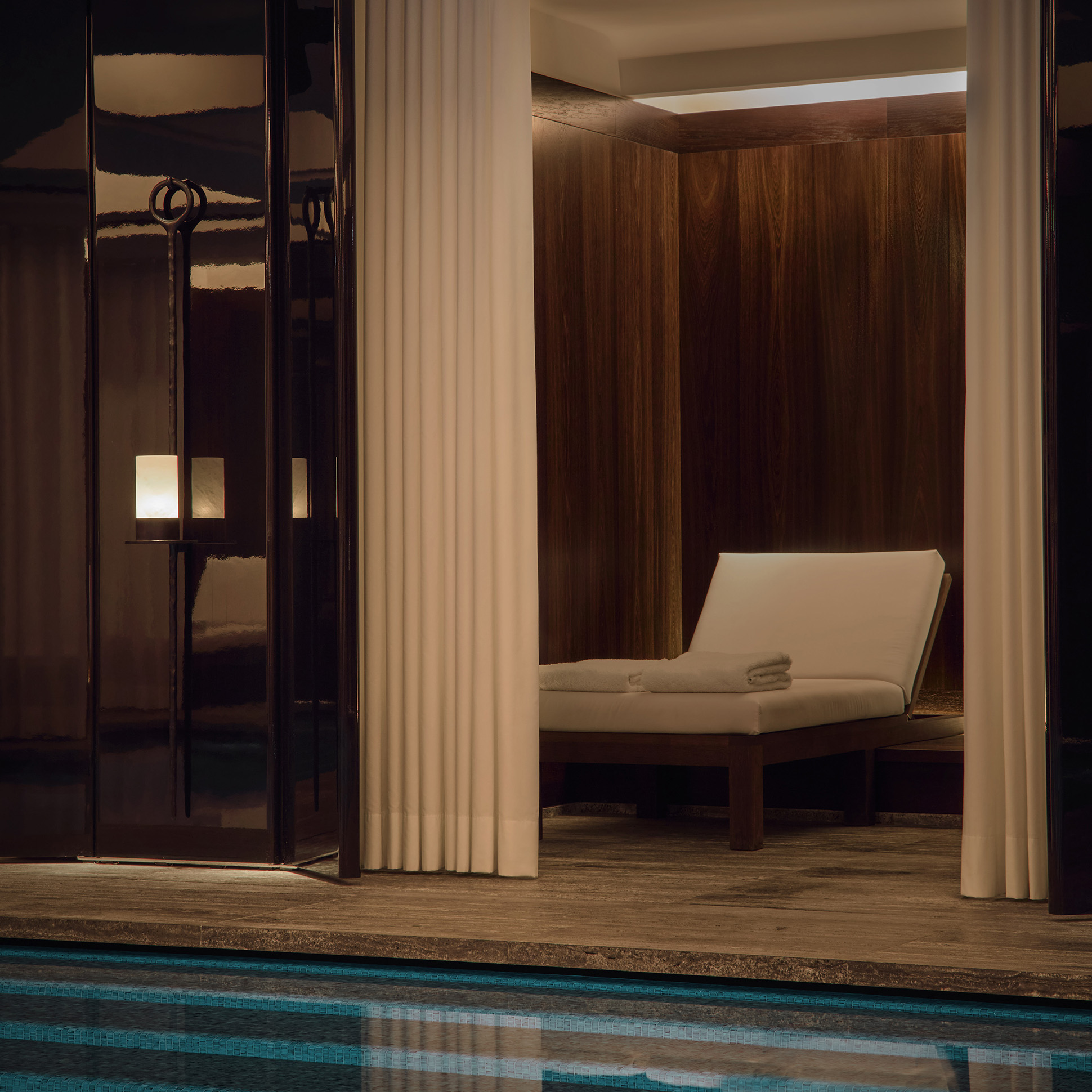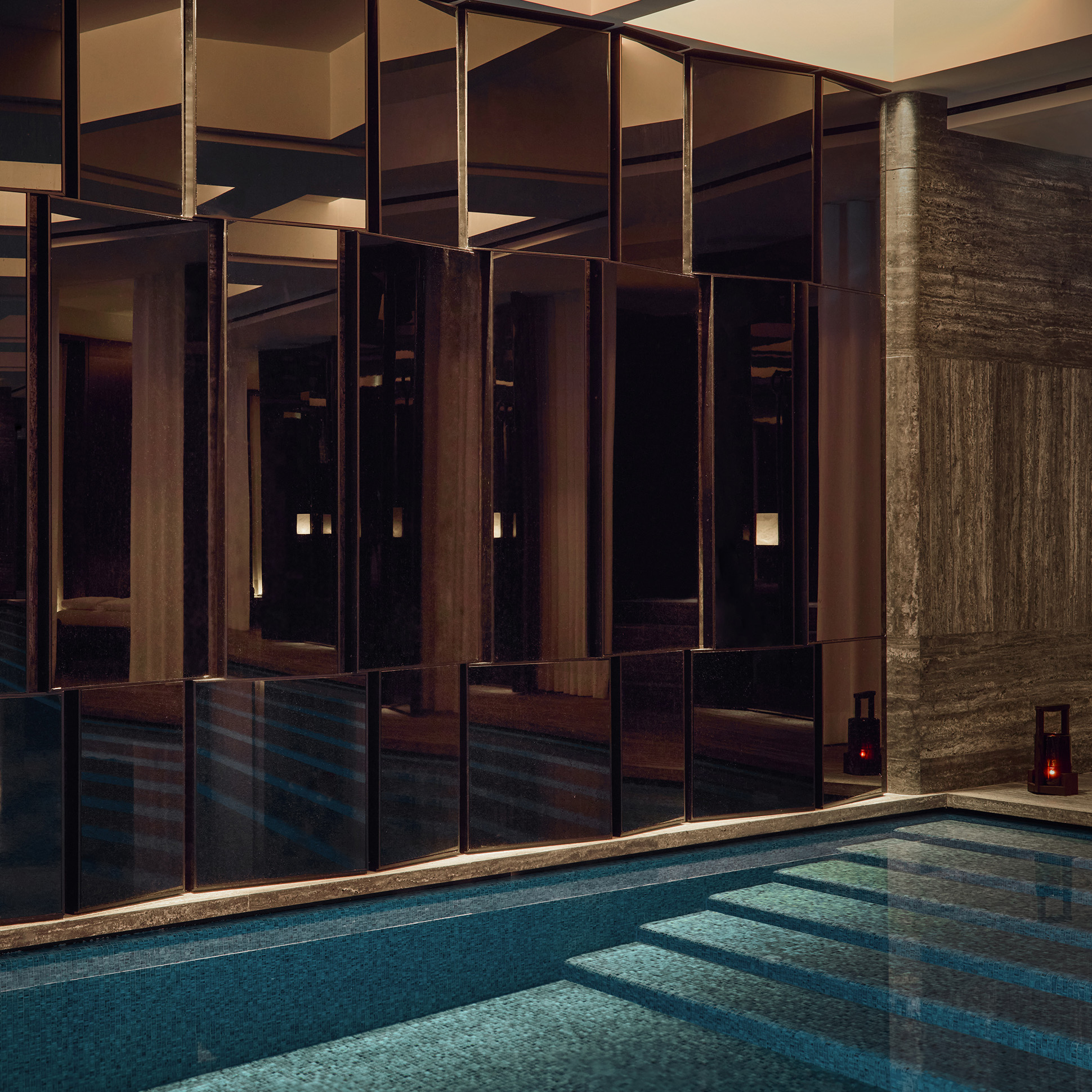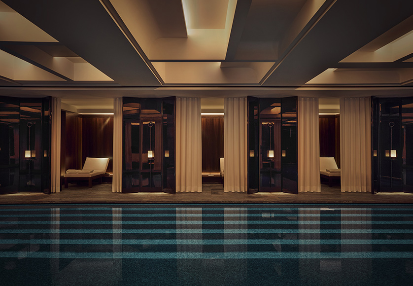 Point focal du spa, une magnifique piscine de 20 mètres de long dans laquelle il est possible de nager. Bassin habillé de mosaïques couleur lagon, plafond à caissons géométriques, cabines doubles s’ouvrant sur la piscine équipées de grandes portes en laque, luminaires Lagune ou bougeoirs muraux Emae entre chaque cabine.