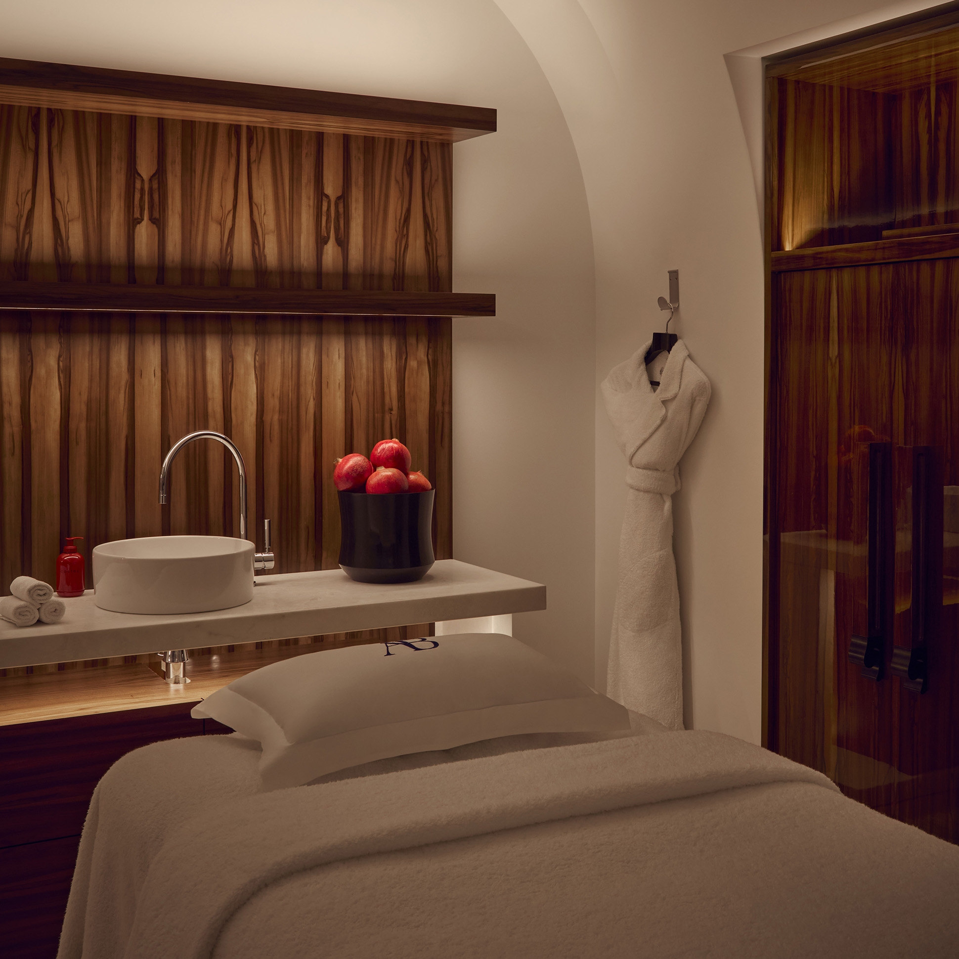Dans ce “cocon” où tout a été pensé pour le confort et l’apaisement, les angles vifs ont été volontairement abolis : ces parois arrondies, ces surfaces lisses sans aucune aspérité, ces matériaux adoucis vont dans le sens du pragmatisme (dans un spa comme sur un yacht, le corps à demi dénudé est plus vulnérable), mais l’incidence esthétique de ce parti-pris est tout aussi déterminante, cette rondeur et ces surfaces soyeuses au toucher ou au contact donnant au lieu un caractère unique.